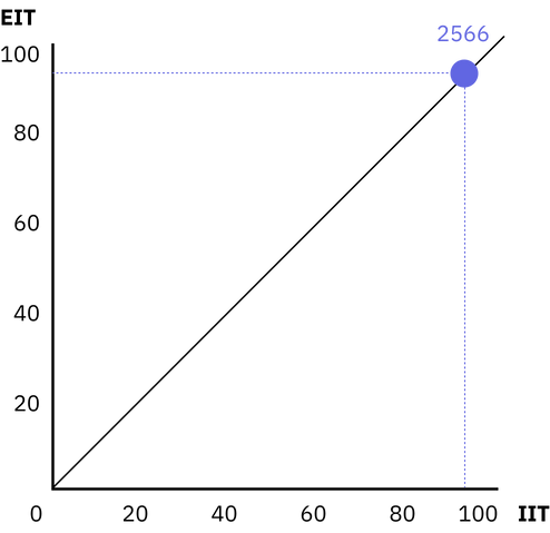หากนำภาพรวมในช่วง 5 ปีมากางเทียบ จะสังเกตเห็นว่า ผลต่างระหว่างคะแนน มีการกระจุกตัวใกล้เส้นตรงกลางและที่ฝั่งคะแนนเต็ม 100 มากขึ้น สะท้อนว่า หน่วยงานมีผลต่างระหว่างคะแนน IIT และ EIT น้อยลง และหน่วยงานได้คะแนนจากทั้ง 2 ตัวชี้วัดสูงขึ้น
